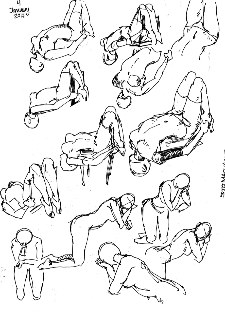 12 pages in which I drew gesture drawings, thumbnails for future illustrations and studies from life, photos and art books.